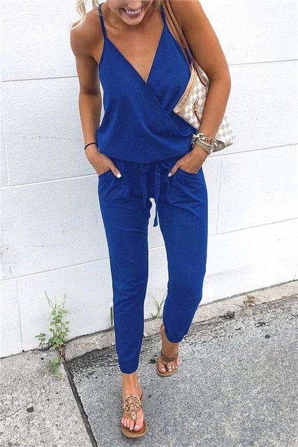 New Arrival Sexy Spaghetti Cross Strap Lace Up Jumpsuits Summer Women V Neck Solid Casual Sleeveless Pockets Long Romper Female