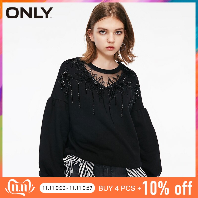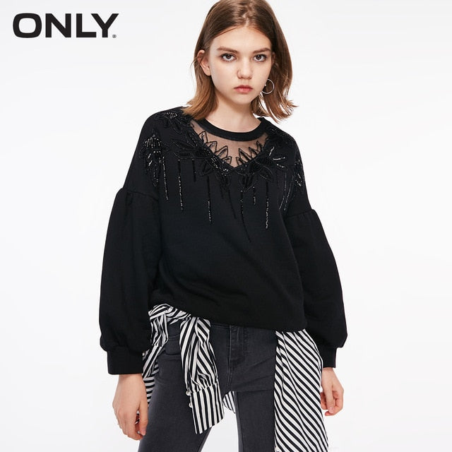 ONLY BF Style Autumn Winter Loose Fit See-through Neckline Sweatshirt Hoodies |11839S566